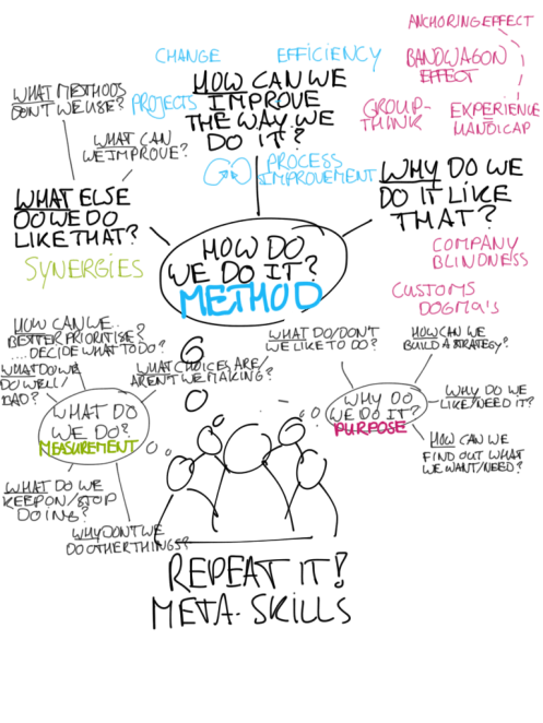I started off by asking questions: “What do we do?”, “How do we do it?” and “Why do we do it” (see post “Who are we?). If I ask the same what-, how- and why-questions about what methods we use, I get some interesting follow-up questions: “What else do we do like that?”, “How can we improve the way we do it?” and “Why do we do it like that”. No rocketscience obviously, but still it helps me to figure out some ‘leads’ to improve how we operate. I scribbled away again, leading to the picture below: