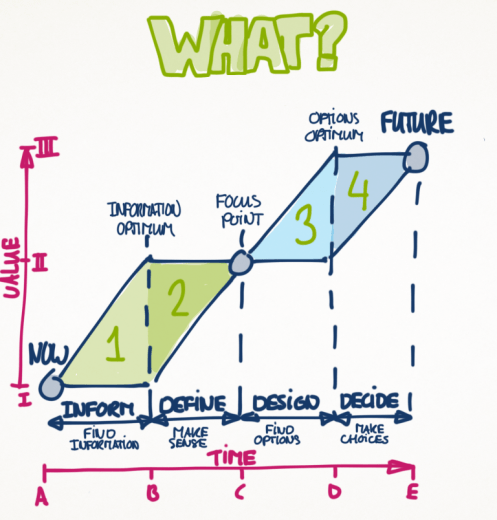 I think the previous posts explain my line of thinking, I’ve just added them up into one graph. I’ve added a big WHAT on top, as I think all the elements described in my picture, wheather it’s sense-making or decision-making, are about the what. What options do I have? What choices do I make? True, you can use your skills and certain methods to make this process happen (how), but most of the value lies in the results (what).