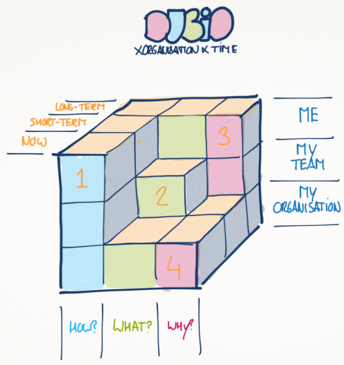 In an experiment to 1) see how I can visualise three variables in a cube-style image, and 2) to see what happens if I multiply the what-, how- and why questions with two perspectives at the same time (in this case an organisational- and time-perspective), I drew the image below. Besides it being a visualisation excercise, I wanted to see if the ‘crossing’ of three interesting variables would lead to a new, even more interesting insight. I believe crossing or multiplying variables is interesting to do, but I also believe it’s only a sense-making method, that requires some context and follow up to have any actual value.