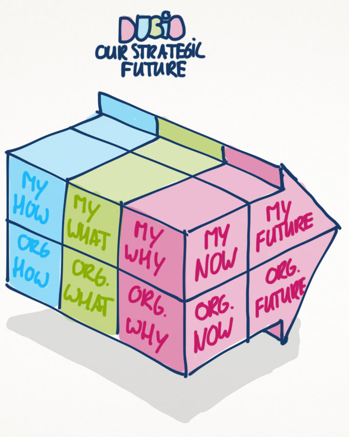 Maybe not the most dificult part of the picture is to describe strategy as a shared direction (I share ‘my what’ with ‘my organisation’s what’, the green part of the arrow). If I can see what choices Our strategic futuremy organisation is making, I can see if there is a match with the choices I am making. And, better yet, I can choose to adapt my choices to those of my organisation. In order to do that, I have to be able to specify the overall strategy of my organisation to my specific situation. Which of my organisation’s choices affect me? To which choices can I contribute? No rocketscience so far, right?
