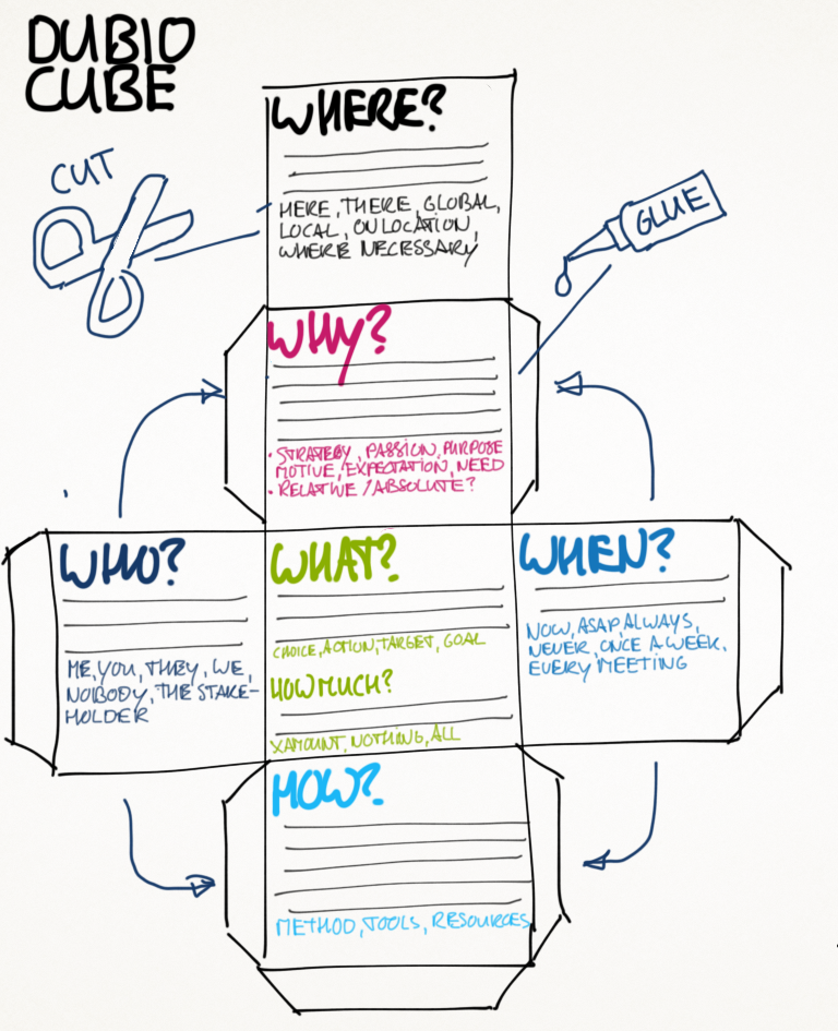 - After you filled in your preferred side of the cube, fill in the other five sides if you can. Some will be hard, but try to -at least- fill in the what-, how- and why- sides. Additional question for the what-side is “how much?”. Try to make the what a bit more specific by adding words like a few, nothing or everything. Don’t think too long about it though.