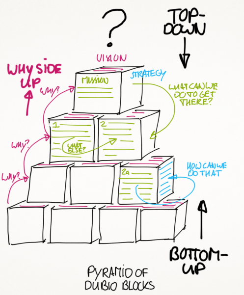 The image below describes how I think the cubes should be stacked. The why-sides of the cube should be aligned vertically, each layar leading up to ultimately our common vision, set of beliefs or values. You can get there by continuing to ask “Why?” for each of the what on a cube. For example, if it says “Benchmark with other companies” on the what-side of a cube, and “To find out what other companies are doing”, you can continue by asking “Why do we want to know what other companies are doing?” and fill in the next cube.