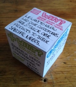 You can download a pdf version of the dubio-cube here, and assembling instructions here. - Based on personal preference, the second step is to start filling in starting with the side of the cube that you like most. If you like, you can base what you fill in on the question “What would success look like for me/my team/my organisation”. Some people might prefer to start with the how-side, others probably want to start with the why-question (See also “What is your what-, how-, why-perspective?“).